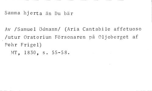 Samma hjerta än Du bär //// Av /Samuel Ödmann/ (Aria Cantabile affetuoso /utur Oratorium Försonaren på Oljoberget af Pehr Frigel) //// MT, 1830, s. 55-58.