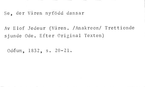 der Våren nyfödd dansar //// Av Elof. Jedeur (Våren. /Anakreon/ Trettionde sjunde Ode. Efter Original Texten) //// Od6um, 1832, s. 20-21.