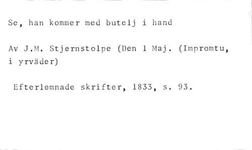 Se, han kommer med butelj i hand //// Av J.M. Stjernstolpe (Den 1 Maj. (Impromtu, i yrväder) //// Efterlemnade skrifter, 1833, s. 93.