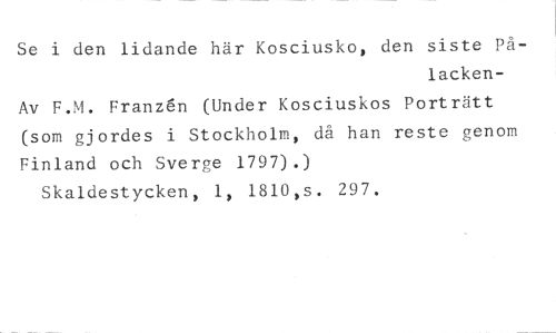 Se i den lidande här Kosciusko, den siste På- //// lacken-Av F.M. Franzén (Under Kosciuskos Porträtt (som gjordes i Stockholm, då han reste genom Finland och Sverge 1797).) //// Skaldestycken, 1, 1810,s. 297.