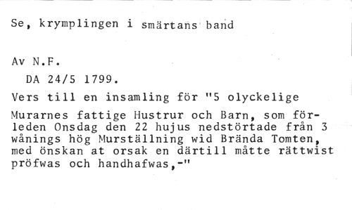 Se, krymplingen i smärtans band //// Av N.F. //// DA 24/5 1799. //// Vers till en insamling för "5 olyckelige //// Murarnes fattige Hustrur och Barn, som för-leden Onsdag den 22 hujus nedstörtade från 3 wånings hög Murställning wid Brända Tomten, med önskan at orsak en därtill måtte rättwist pröfwas och handhafwas,-"