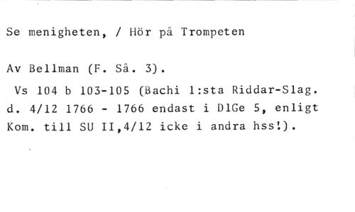 Se menigheten, / Hör på Trompeten Av Bellman (F. Så. 3). //// Vs 104 b 103-105 (Bachi l:sta Riddar-Slag. d. 4/12 1766 - 1766 endast i D1Ge 5, enligt Kom. till SU 11,4/12 icke i andra hss!).