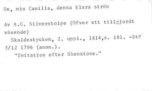 Se, min Camilla, denna klara ström //// Av A.G. Silverstolpe (Öfver ett tillgjordt väsende) //// Skaldestycken, 2. uppl., 1814,s. 181. -StP 3/12 1796 (anon.). //// "Imitation efter Shenstone."