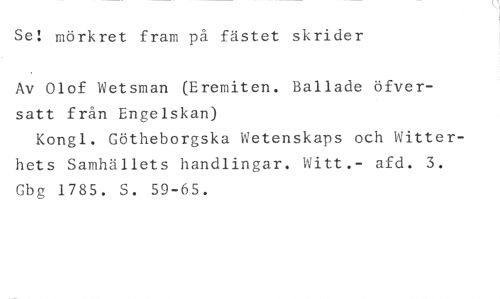 Se! mörkret fram på fästet skrider //// Av Olof Wetsman (Eremiten. Ballade öfversatt från Engelskan) //// Kongl. Götheborgska Wetenskaps och Witterhets Samhällets handlingar. Witt.- afd. 3. Gbg 1785. S. 59-65.