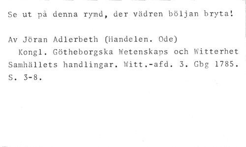 Se ut på denna rymd, der vädren böljan bryta: //// Av Jöran Adlerbeth (liandelen. Ode) //// Kongl. Götheborgska Wetenskabs och Witterhet Samhällets handlingar. Witt.-afd. 3. Gbg 1785. S. 3-8.
