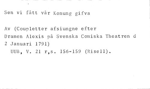 Sen vi fått vår Konung gifva //// Av (Coupletter afsiungne efter //// Dramen Alexis på Svenska Comiska Theatren d 2 Januari 1791) //// UUB, V. 21 r,s. 156-159 (Risell).