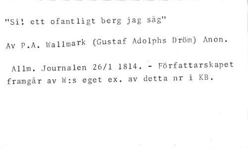 "Si: ett ofantligt berg jag säg" //// Av P.A. Wallmark (Gustaf. Adolphs Dröm) Anon. //// Allm. Journalen 26/1 1814. - Författarskapet framgår av W:s eget ex. av detta nr i KB.