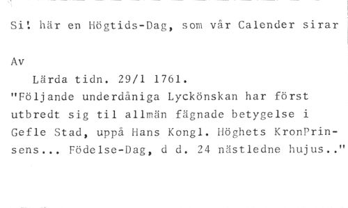 Si: här en Högtids-Dag, som vår Calender sirar //// Av //// Lärda tidn. 29/1 1761. //// "Följande underdåniga Lyckönskan har först utbredt sig til allmän fägnade betygelse i Gefle Stad, uppå Hans Kongl. Höghets Kronprinsens... Födelse-Dag, d d. 24 nästledne hujus.."