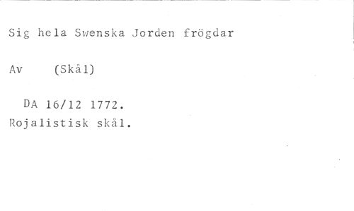 Sig hela Swenska Jorden frögdar //// Av (Skål) //// DA 16/12 1772. Rojalistisk skäl.