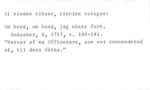 Si vinden blåser, vimplen svingar: //// Om bord, om bord, jag måste fort. Småsaker, 8, 1757, s. 140-141. //// "Wersar af en Officerare, som war commenderad ut, til dess Sköna."