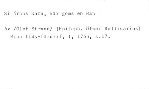 Si Ärans Barn, här göms en Man //// Av /Olof Strand/ (Epitaph. Öfwer Bellisarius) Mina tids-fördrif, 1, 1763, s.17.
