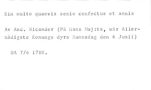 Sim multo quarnvis senio confectus et annis //// Av And. Nicander (På Hans Maj:ts, wår Allernådigste Konungs dyra Namnsdag den 6 Junii) //// DA 7/6 1780.