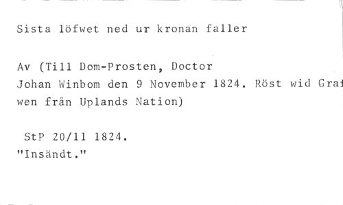 Sista löfwet ned ur kronan faller //// Av (Till Dom-Prosten, Doctor //// Johan Winbom den 9 November 1824. Röst wid Graf wen frän Uplands Nation) //// StP 20/11 1824. "Insändt."