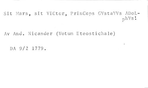 SIt Mars, sIt VICtor, PrinCeps CVstaVVs ADo1.- //// PhVs' • //// Av And. Nicander (Votum Eteostichale) DA 9/2 1779.