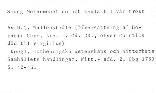 Sjung Melpomene! nu och spela til vår tröst //// Av M.G. Wallenstråle (CSfversättning af Horatii Carm. Lib. I. Od. 24., öfver Ouintils död til Virgilius) //// Kongl. Götheborgska Wetenskaps och Witterhets Samhällets handlingar. Witt.- afd. 2. Gbg 1780 S. 42-43.