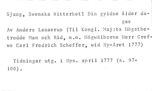 Sjung, Swenska Vitterhet Din gyldne ålder da- //// gas //// Av Anders Lanaerus (Til Kongl. Maj:ts Högstbetrodde Man och Råd, m.m. Högwälborne Herr Grefwe Carl Fredrich Scheffer, wid Ny-Året 1777) //// Tidningar utg. i tips. april 1777 (s. 97- 100).