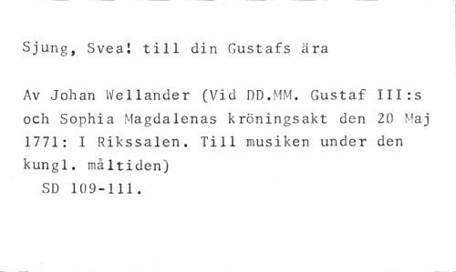 Sjung, Svea! till din Gustafs ära //// Av Johan Wellander (Vid DD.MM. Gustaf III:s och Sophia Magdalenas kröningsakt den 20 Maj 1771: I Rikssalen. Till musiken under den kungl. måltiden) //// SD 109-111.