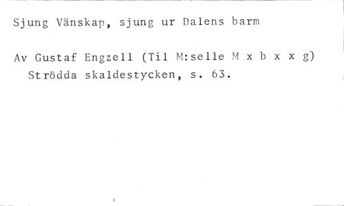 Sjung Vänskap, sjung ur Dalens barm //// Av Gustaf Engzell (Til M:selleMxbxx g) Strödda skaldestycken, s. 63.