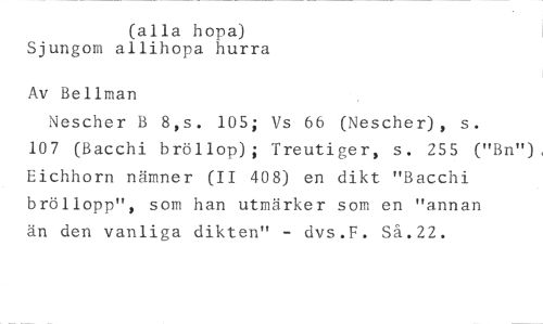 (alla hopa) //// Sjungom allihopa hurra //// Av Bellman //// Nescher B 8,s. 105; Vs 66 (Nescher), s. 107 (Bacchi bröllop); Treutiger, s. 255 ("Bn"), Eichhorn nämner (II 408) en dikt "Bacchi bröllopp", som han utmärker som en "annan än den vanliga dikten" - dvs.F. Så.22.