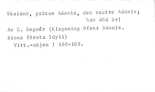 Skaldmö, gråtom Adonis, den vackre Adonis; //// han död är! //// Av G. Regngir (Klagosång öfver Adonis. Bions första Idyll) //// Vitt.-nöjen I 100-103.