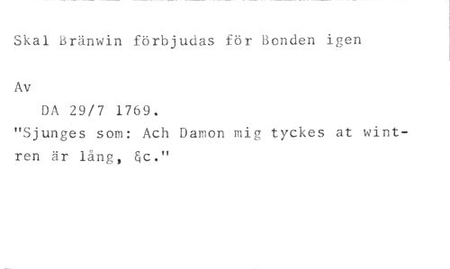Skal Bränwin förbjudas för Bonden igen //// Av //// DA 29/7 1769. //// "Sjunges som: Ach Damon mig tyckes at wintren är lång, &c."