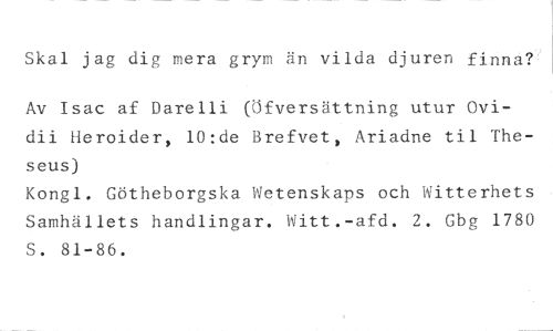 Skal jag dir mera grym än vilda djuren finna? //// Av Isac af Darelli Pfversättning utur Ovidii Heroider, l0:de Brefvet, Ariadne til Theseus) //// Kongl. Götheborgska Wetenskaps och Witterhets • SamhälletS handlingar. Witt.-afd. 2. Gbg 1780 S. 81-86.