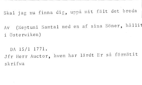 Skal jag nu finna dig, uppå mit fält det breda //// Av (Neptuni Samtal med en af sina Söner, hållit i Österwiken) //// DA 15/1 1771. //// Jfr Herr Auctor, hwem har lärdt Er så förmätit skrifwa