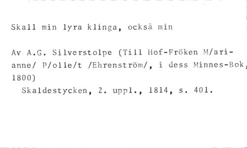 Skall min lyra klinga, ocksä min //// Av A.G. Silverstolpe (Till Hof-Fröken Warianne/ P/olle/t /Ehrenströni/, i dess Minnes-Bok 1800) //// Skaldestycken, 2. uppl., 1814, s. 401.