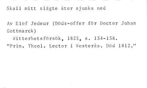 Skall mitt slägte äter sjunka ned //// Av Elof Jedeur (Döds-offer för Doctor Johan Gottmarck) //// Witterhetsförsök, 1825, s. 134-138. //// "Prim. Theol. Lector i Westerås. Död 1812."