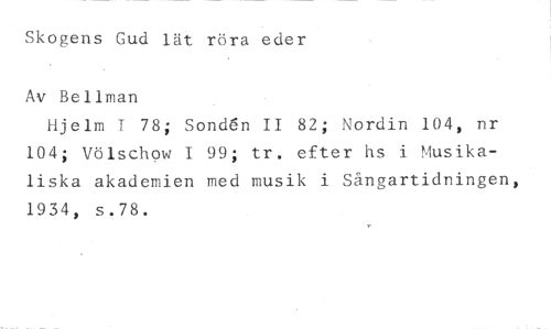 Skogens Gud lät röra eder //// Av Bellman //// Hjelm T 78; Sondlin II 82; Nordin 104, nr 104; Völschow I 99; tr. efter hs i Musikaliska akademien med musik i Sångartidningen, 1934, s.78.