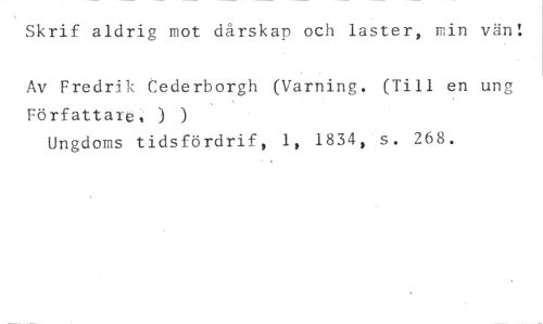 Skrif aldrig mot dårskap och laster, min vän: //// Av Fredrik Cederborgh (Varning. (Till en ung Författart; ) ) //// Ungdoms tidsfördrif, 1, 1834, s. 268.