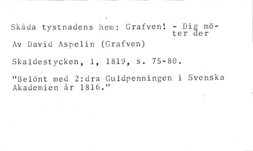 Skåda tystnadens hem: Grafven! - Di möer //// ter //// Av David Aspelin (Grafven) Skaldestycken, 1, 1819, s. 75-80. //// "Belönt med 2:dra Guldpenningen i Svenska Akademien år 1816."