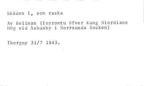 Skäden 1, som raska //// Av Bellman (Inpromtu över Kung Niordians Hög vid Åshusby i Norrsunda Socken) //// Thorgny 31/7 1843.