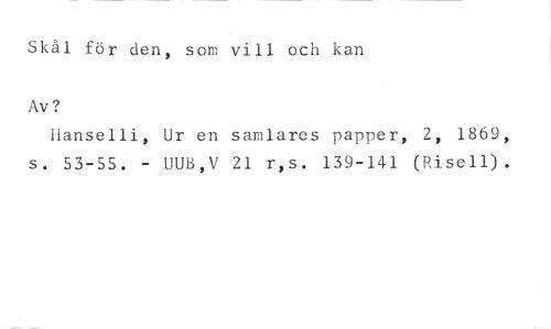 Skål för den, som vill och kan //// Av? //// Hanselli, Ur en samlares papper, 2, 1869, s. 53-55. - UUB,V 21 r,s. 139-141 (Risen.).