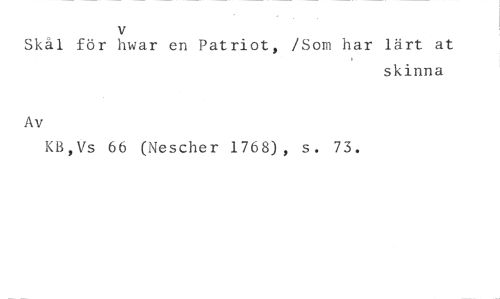 v //// Skål för hivar en Patriot, /Som har lärt at //// skinna //// Av //// K13,Vs 66 (Nescher 1768), s. 73.