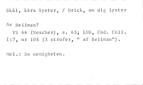 Skål, kära Syster, / Drick, om di, lyster //// Av Bellman? //// VS 66 (Nescher), s. 63; LUB, Cod. Coll. 1:7, nr 108 (3 strofer, " af Bellman"). //// .: Se menigheten.