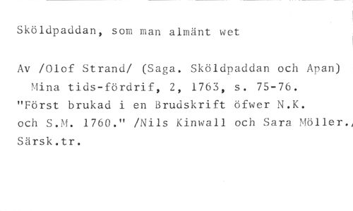 Sköldpaddan, som man almänt wet //// Av /Olof Strand/ (Saga. Sköldpaddan och Apan) Mina tids-fördrif, 2, 1763, s. 75-76. //// "Först brukad i en Brudskrift öfwer N.K. //// och S.M. 1760." /Nils Kinwall och Sara Möller., Särsk.tr.