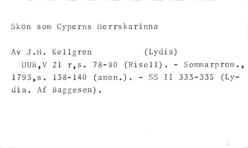 Skön som Cyperns Herrskarinna //// Av J.H. Kellgren (Lydia) //// UUB,V 21 r,s. 78-80 (Risell). - Sommarprom., 1793,s. 138-140 (anon.). - SS II 333-335 (Lydia. Af Baggesen).
