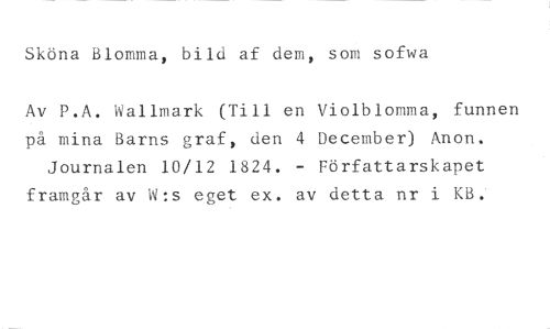 Sköna Blomma, bild af dem, som sofwa //// Av P.A. Wallmark (Till en Violblomma, funnen på mina Barns graf, den 4 December) Anon. Journalen 10/12 1824. - Författarskapet framgår av W:s eget ex. av detta nr i KB.'