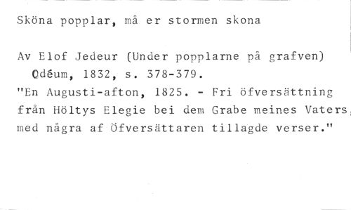 Sköna popplar, må er stormen skona //// Av Elof Jedeur (Under popplarne på grafven) Od6um, 1832, s. 378-379. //// "En Augusti-afton, 1825. - Fri öfversättning från Höltys Elegie bei dem Grabe meines Vaters, med några af Översättaren tillagde verser."