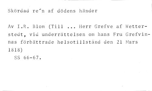 Skördad re'n af dödens händer //// Av I.R. Blom (Till ... Herr Grefve af Wetterstedt, vid underrättelsen om hans Fru Grefvinnas förbättrade helsotillstånd den 21 Mars 1818) //// SS 66-67.