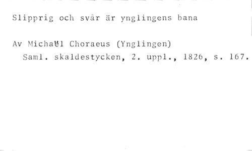 Slipprig och svär är ynglingens bana //// Av Michail Choraeus (Ynglingen) //// Saml. skaldestycken, 2. uppi., 1826, s. 167.