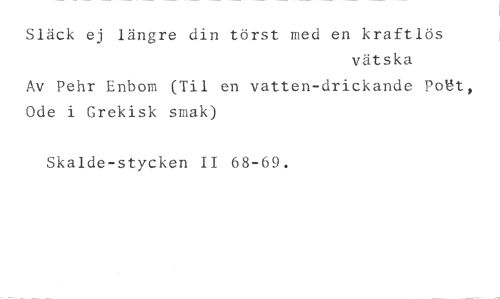 Släck ej längre din törst med en kraftlös //// vätska //// Av Pehr Enbom (Til en vatten-drickande Pott, Ode i Grekisk smak) //// Skalde-stycken II 68-69.