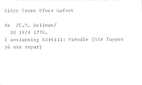 Släpp Örnen öfwer Bafwet //// Av /C.M. Bellman //// /DA 19/4 1770. //// I anslutning härtill: Parodie (När Tuppen på oss ropar)