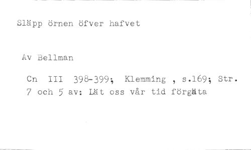 Släpp örnen öfver hafvet //// Av Bellman //// Cn III 398-399; Klemming s.169; Str. //// 7 och 5 av: Lät oss vår tid förgäta
