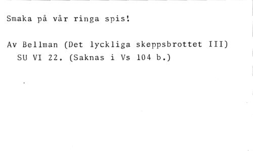 Smaka på vår ringa spis: //// Av Bellman (Det lyckliga skeppsbrottet III) SU VI 22. (Saknas i Vs 104 b.)