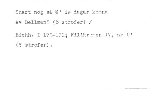 Snart nog så ä' de dagar komna Av Bellman? (8 strofer) //// /Eichh. I 170-171; Filikromen IV, nr 12 (5 strofer).