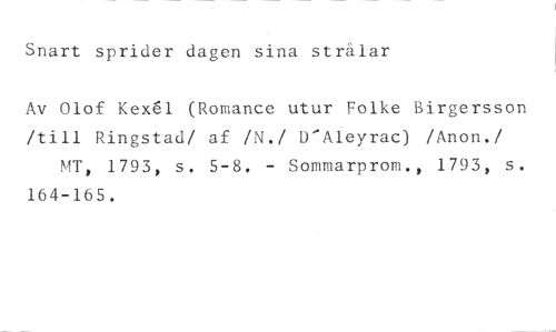 Snart sprider dagen sina strålar //// Av Olof Kex1 (Romance utur Folke Birgersson /till Ringstad/ af /N./ D'Aleyrac) /Anon./ MT, 1793, s. 5-8. - Sommarprom., 1793, s. 164-165.