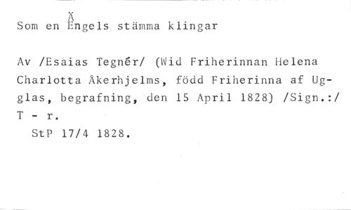 Ä //// Som en Engels stämma klingar //// Av /Esaias Tegn6r/ (Wid Friherinnan Helena Charlotta Åkerhjelms, född Friherinna af Ugglas, begrafning, den 15 April 1828) /Sign.:/ T - r. //// StP 17/4 1828.