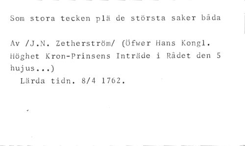 Som stora tecken plä de största saker båda //// Av /J.N. Zetherström/ (Ufwer Hans Kongl. Höghet Kron-Prinsens Inträde i Rådet den 5 hujus...) //// Lärda tidn. 8/4 1762.